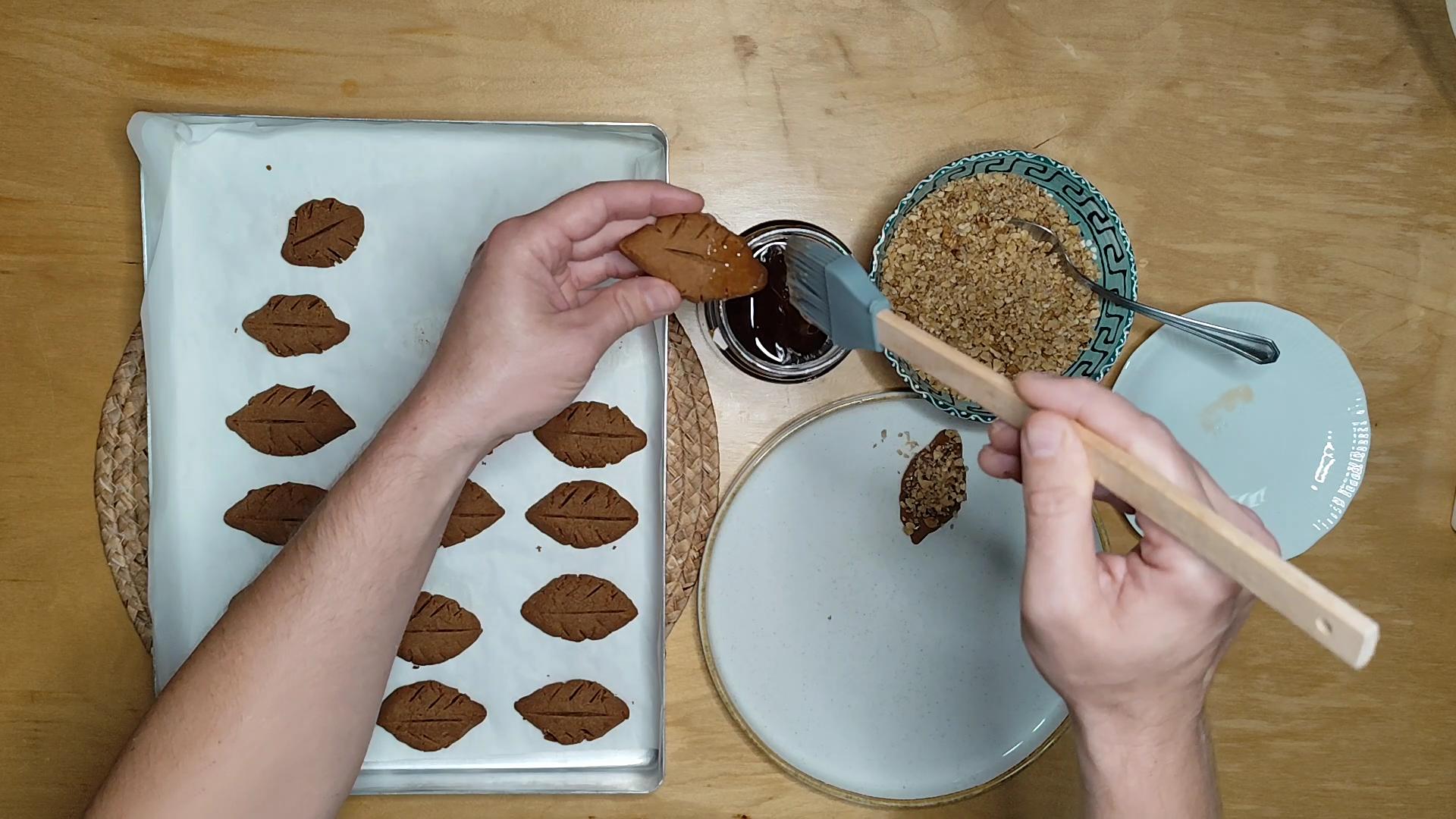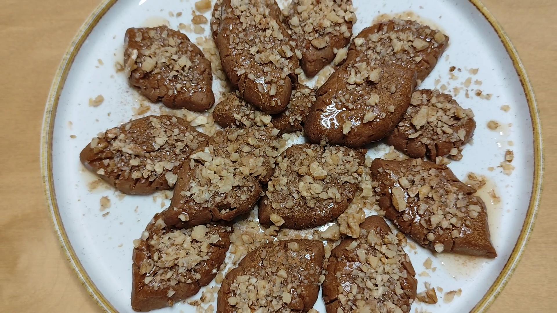 Καβουρδίζουμε το αλεύρι στο τηγάνι όχι πολύ, να αποκτήσει ένα εκρού χρώμα περίπου 8 λεπτά σε μέτρια φωτιά. Όχι σε δυνατή να μην σας καεί. Σε ένα μπολ βάζουμε το ελαιόλαδο, το χυμό πορτοκαλιού, το υδρόμελι και το σιρόπι του χουρμά. Ανακατεύουμε καλά μετα προσθέτουμε την κανέλα και το γαρίφαλο, το ξύσμα και ανακατεύουμε λίγο και προσθέτουμε το αλεύρι ( δεν μας πειράζει αν είναι ζεστό η κρύο, μόνο αν το βάλετε κρύο να το κοσκινίσετε για να μην σας κάνει μικρούς βόλους αλευριού μέσα στα φοινίκια. Αν είναι ζεστό με καλό ζύμωμα οι βόλοι θα διαλυθούν ) και το ζυμώνουμε καλά. Σε ένα ταψί βάζουμε λαδόκολλα και πλάθουμε τα φοινίκια 20 γρ το ένα τα κάνουμε μπαλάκια και τα πιέζουμε στο ταψί κάνοντας μύτες στις άκριες τους να μοιάζουν με φύλλα. Με ένα μαχαίρι χαράζουμε πάνω σαν κλαδί φοίνικα. Τα ψήνουμε σε μέτριο φούρνο για 20-30 λεπτά. Όταν κρυώσουν θα σκληρύνουν. Με ένα πινέλο αλείφουμε το μέλι και τέλος βάζουμε τα καρύδια που αν θέλουμε τα καβουρδίζουμε λίγο στο τηγάνι και τους βάζουμε επιπλέον λίγη κανέλα και λίγο γαρίφαλο μέσα.