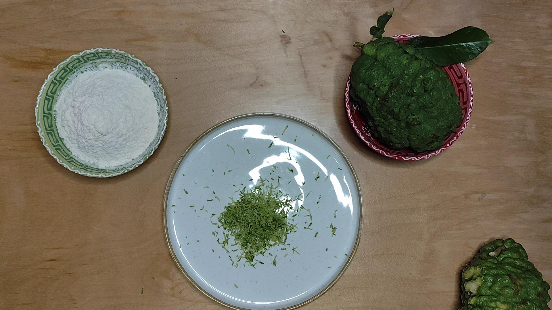 Έχουμε καβουρδίσει και αφήσει το αλεύρι να κρυώσει. Το κοσκινίζουμε. Το καρύδι το καβουρδίζουμε και το αλέθουμε και του βάζουμε τα αρωματικά μας. Ανάλογα τις προτιμήσεις μας. Πλένουμε καλά και σκουπίζουμε καλά το περγαμόντο και ξύνουμε λίγο περίπου 5γρ έως 8 γρ προσοχή μόνο το εξωτερικό μέρος του περγαμόντου όχι το λευκό γιατί πικρίζει.